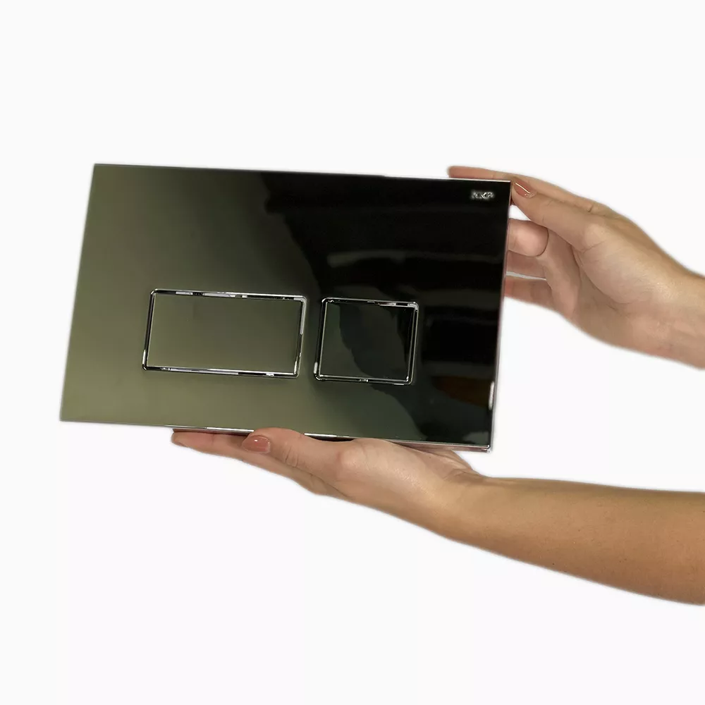 It has two buttons: for a large and a small drain. The button for a large drain has dimensions: 96 x 49.5 mm, and for a small drain 57.5 x 49.5 mm.