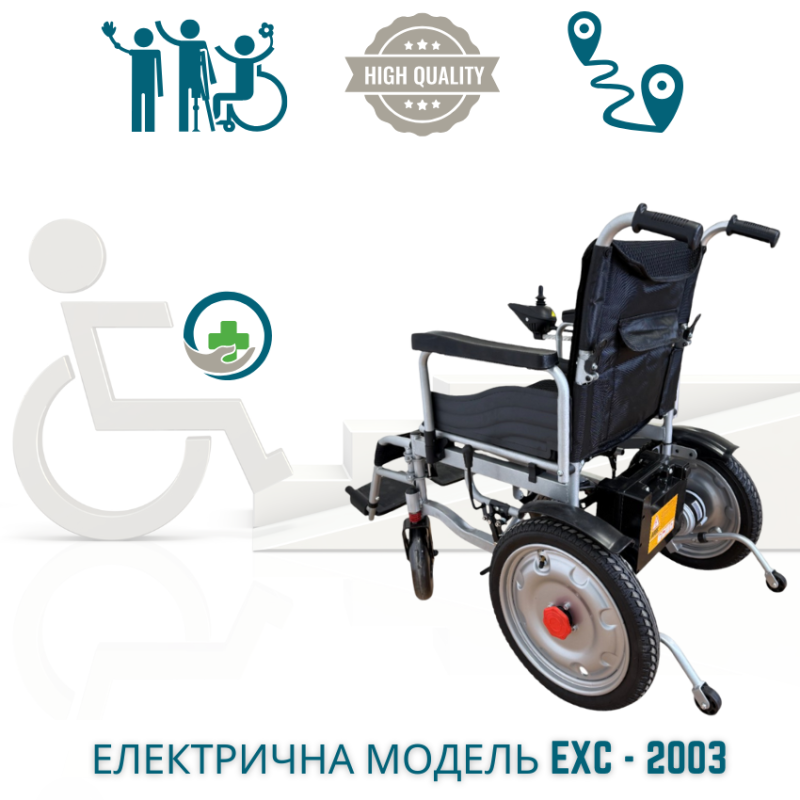 EXC-2003 — це надійна й універсальна інвалідна коляска, призначена для повсякденного використання та забезпечення свободи пересування на різних типах місцевості. Зручний складний візок має електрокерування. Він обладнаний комфортним сидінням, спинкою та підніжками (поворотні). Візок має інтуїтивно зрозумілий і легко доступний пульт керування для регулювання швидкості та інших параметрів.