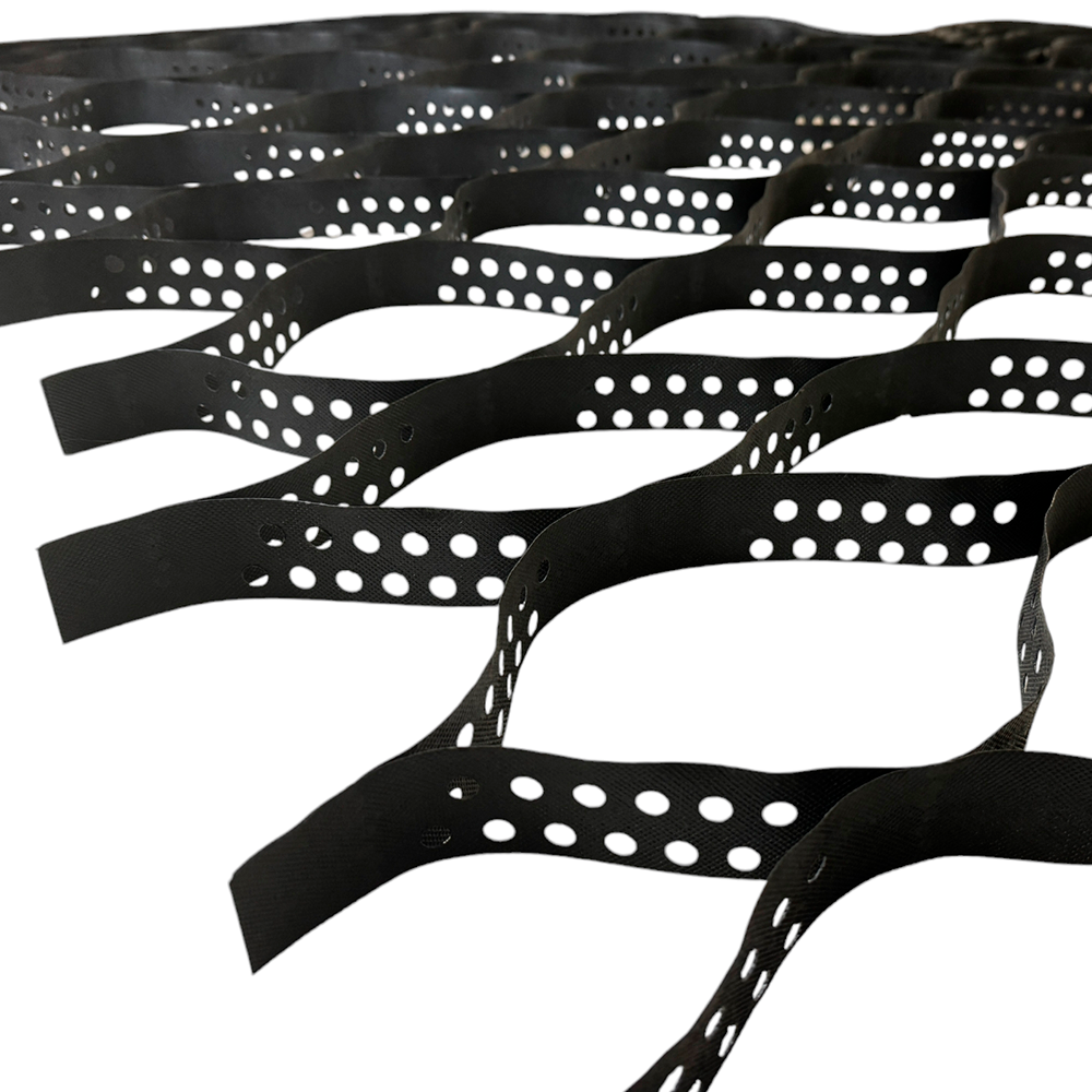 Матеріал виготовляється з гнучкого, але міцного поліетилену високої щільності (HDPE), завдяки чому георешітка здатна адаптуватися до складного рельєфу місцевості. Вона надійно фіксується на нерівних ділянках, схилах, укосах та в інших зонах з підвищеним ризиком ерозії або осідання ґрунту.