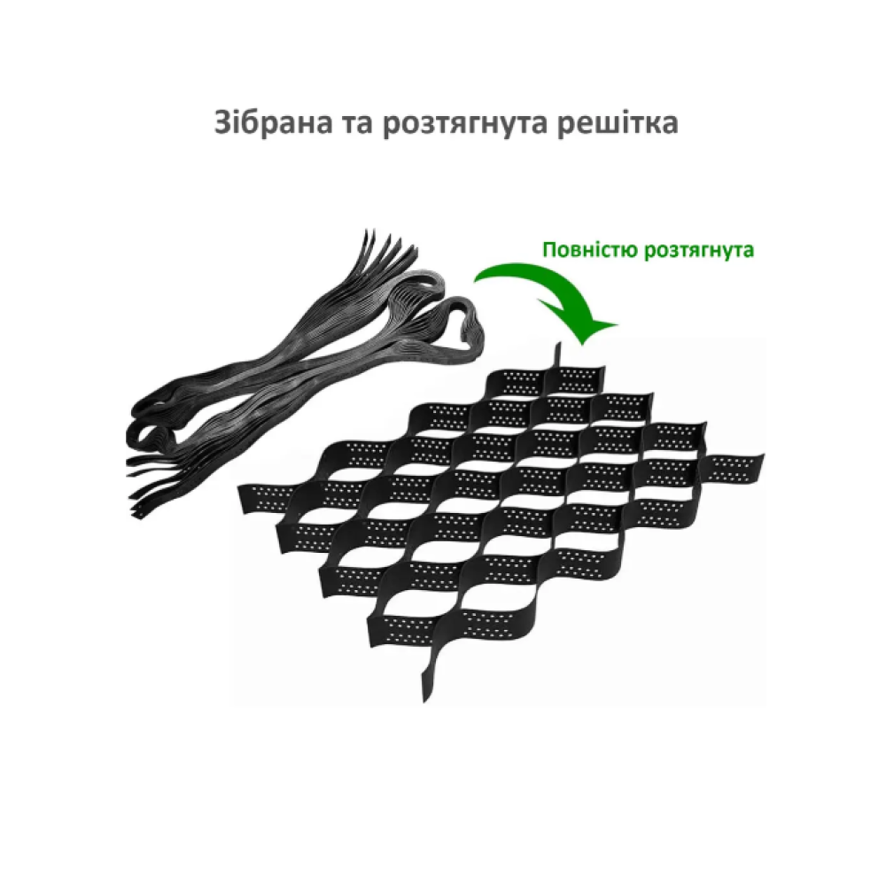 Материал производится из гибкого, но прочного полиэтилена высокой плотности (HDPE), благодаря чему георешетка способна адаптироваться к сложному рельефу местности. Она надежно фиксируется на неровных участках, склонах, откосах и других зонах с повышенным риском эрозии или оседания почвы.