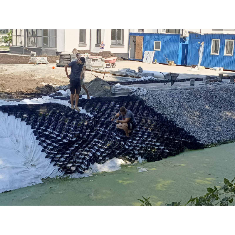 Использование объемной георешетки значительно повышает устойчивость почвы к эрозии, эффективно предотвращает оползни, обвалы и другие деформации поверхности, обеспечивая надежную защиту даже в сложных геологических условиях.