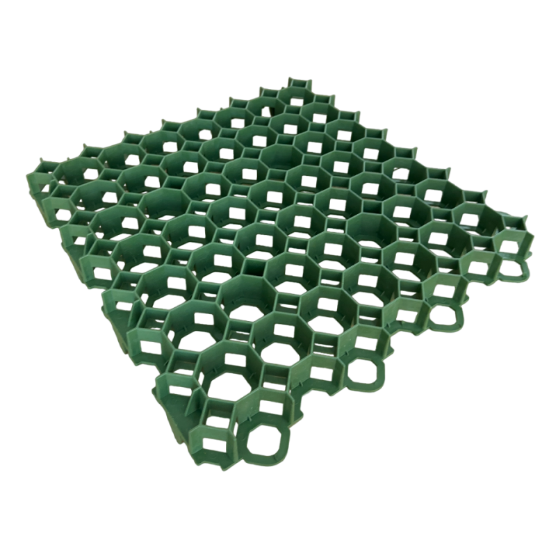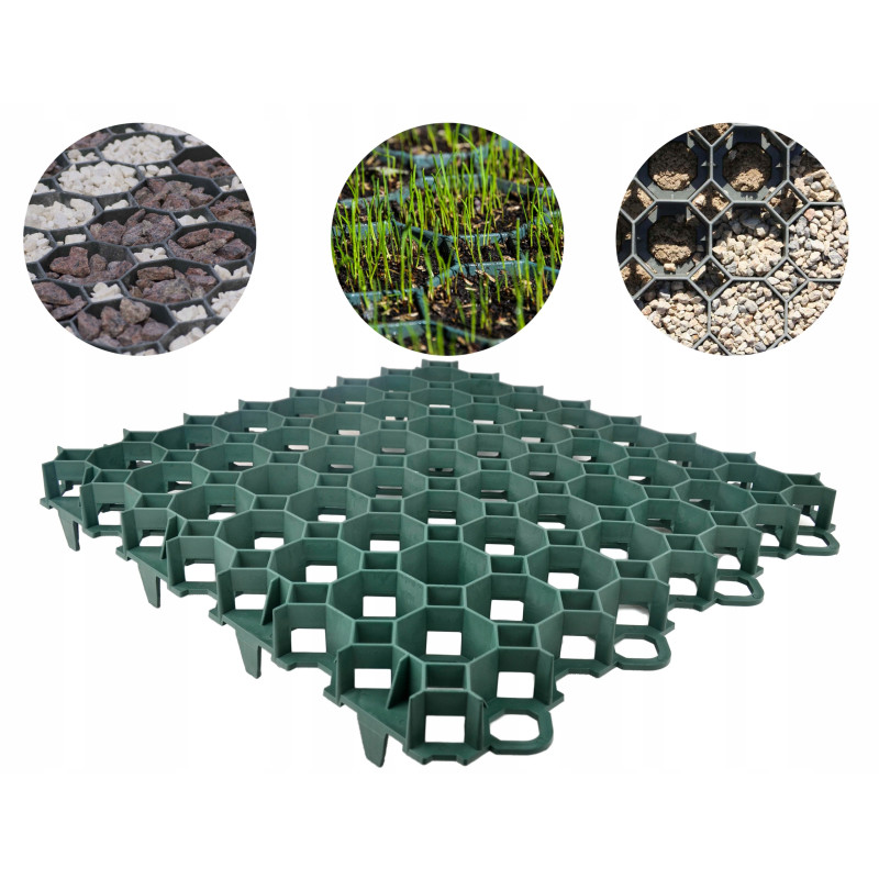 Решітка виготовлена із високоміцного поліетилену та являє собою сукупність пластикових модулів ромбовидної форми, з’єднаних в суцільне полотно. Комірчаста структура решіток добре закріплює корені пророслої трави, надійно захищає їх від механічних пошкоджень та перешкоджає утворенню ям. Пластикова решітка ідеально стабілізує поверхню як для пішохідного, так і колісного руху, рівномірно розподіляючи навантаження на ґрунт. Завдяки цьому, зелена зона буде утримуватись в гарному стані навіть при навантаженні від транспортних засобів.