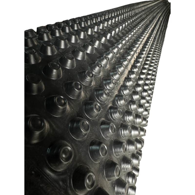 Шипоподібна мембрана 500 (геомембрана) – виготовляється методом тиснення з поліетилену високої густини (HDPE) за стандартом EN 13967:2012. Має округлі виступи заввишки 8мм для забезпечення дренажного прошарку. Щільність мембрани 500 г/м2.