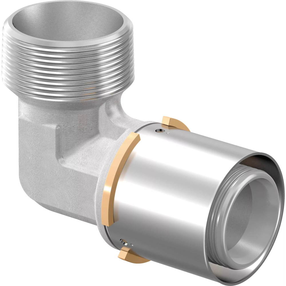 Угловой пресс-фитинг предназначен для соединения трубы с элементами, имеющими наружную трубную резьбу Rp 1 1/4” . Он обеспечивает поворот соединения под углом 90°, при этом сохраняя высокую герметичность и надежность в длительной эксплуатации.