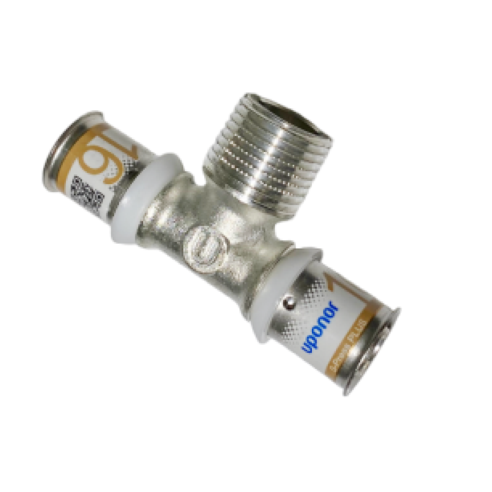 Тройник Uponor выполняет три соединения в трубопроводах: две ветки труб и одна наружная резьба для подключения устройств или оборудования. Он обеспечивает надежное распределение потока и удобство монтажа в системах отопления, холодного и горячего водоснабжения.