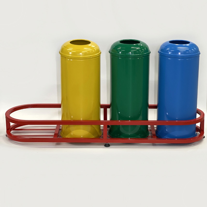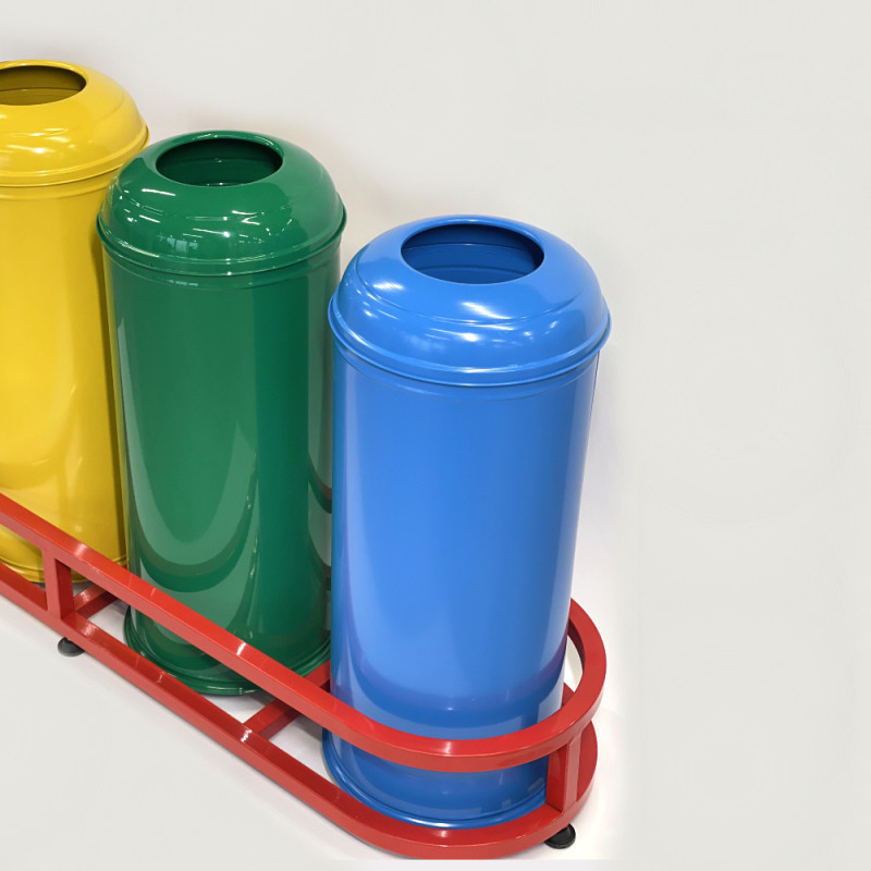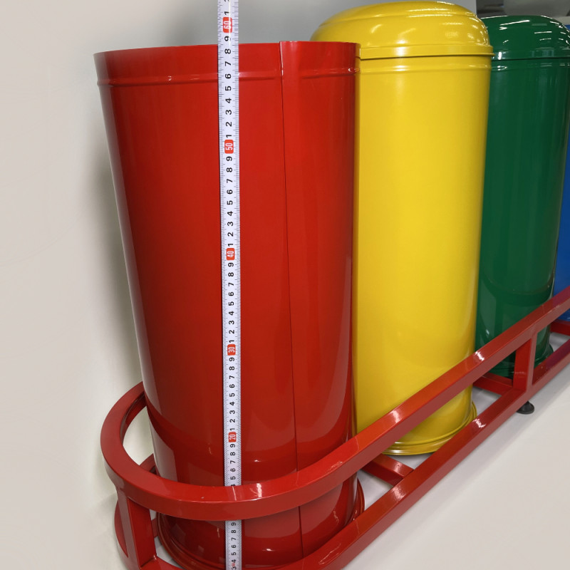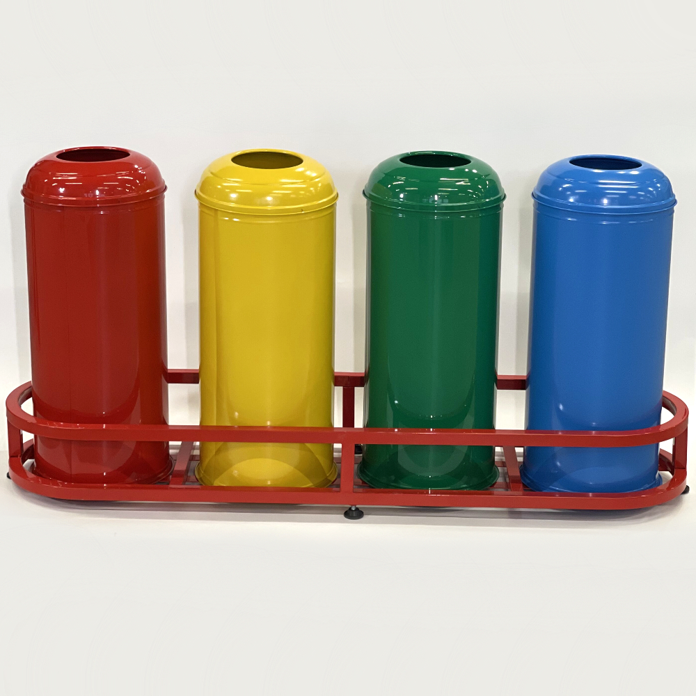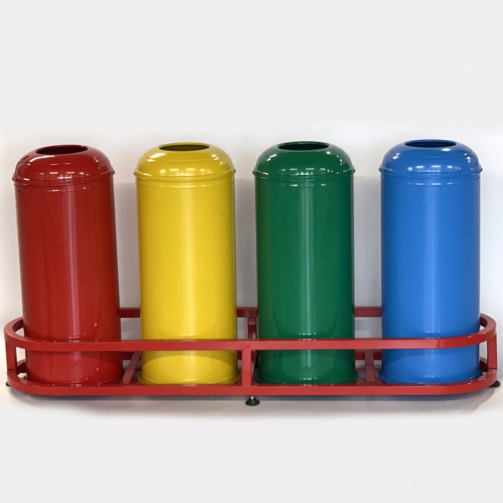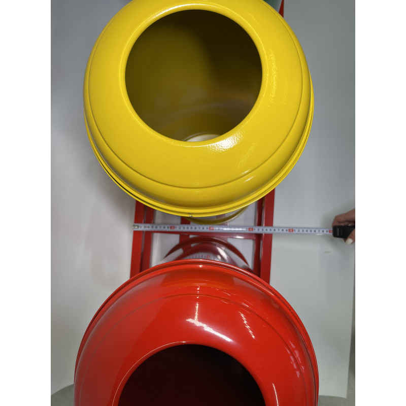 Набор контейнеров для сортировки мусора включает 4 ведра и рамку-держатель на ножках. Общая длина конструкции с рамой – 150 см. Высота каждого ведра – 65 см и диаметр – 27 см.
