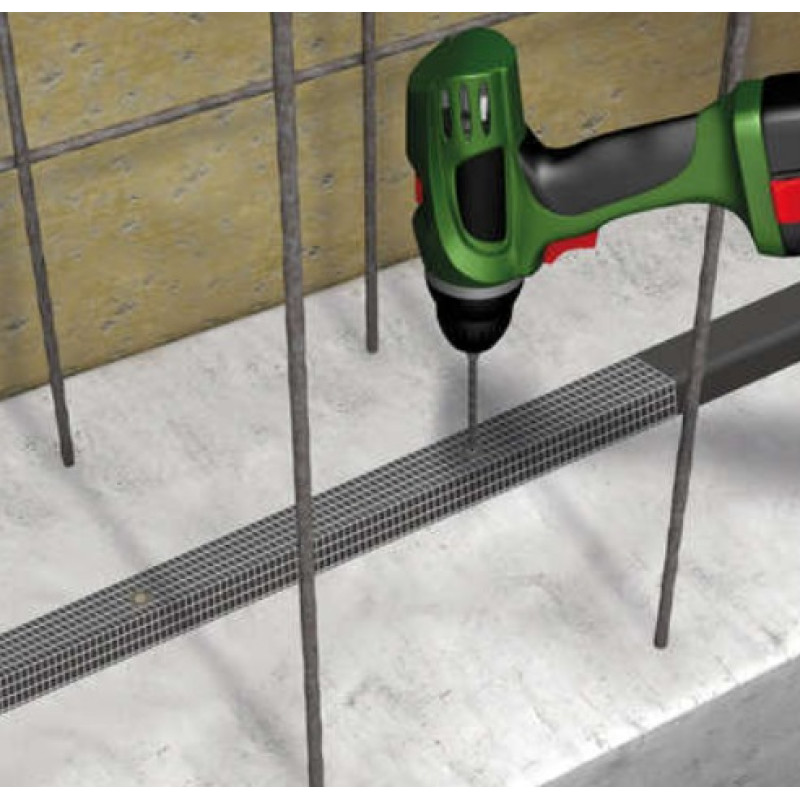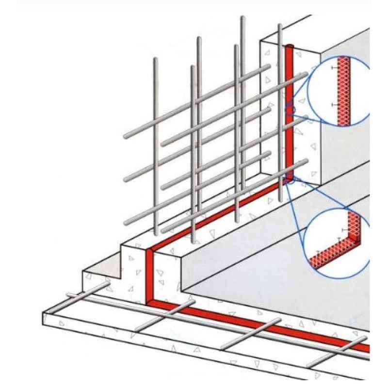 Якщо площа заливного елемента велика, а рівень бічного тиску дуже високий, необхідно підвищити надійність кріплення за допомогою просічно-витяжної сітки із оцинкованої сталі. Монтують бентонітовий шнур таким чином, щоб він був прикріплений дюбелями до бетонної поверхні разом з сіткою.
