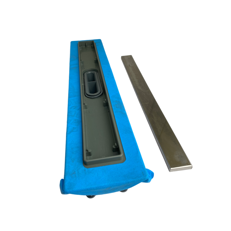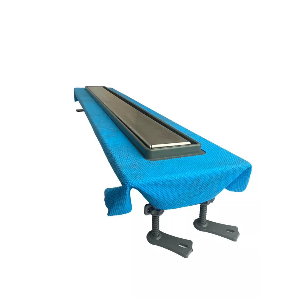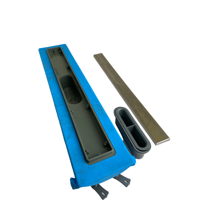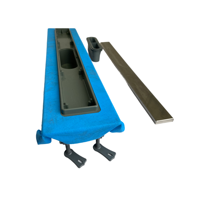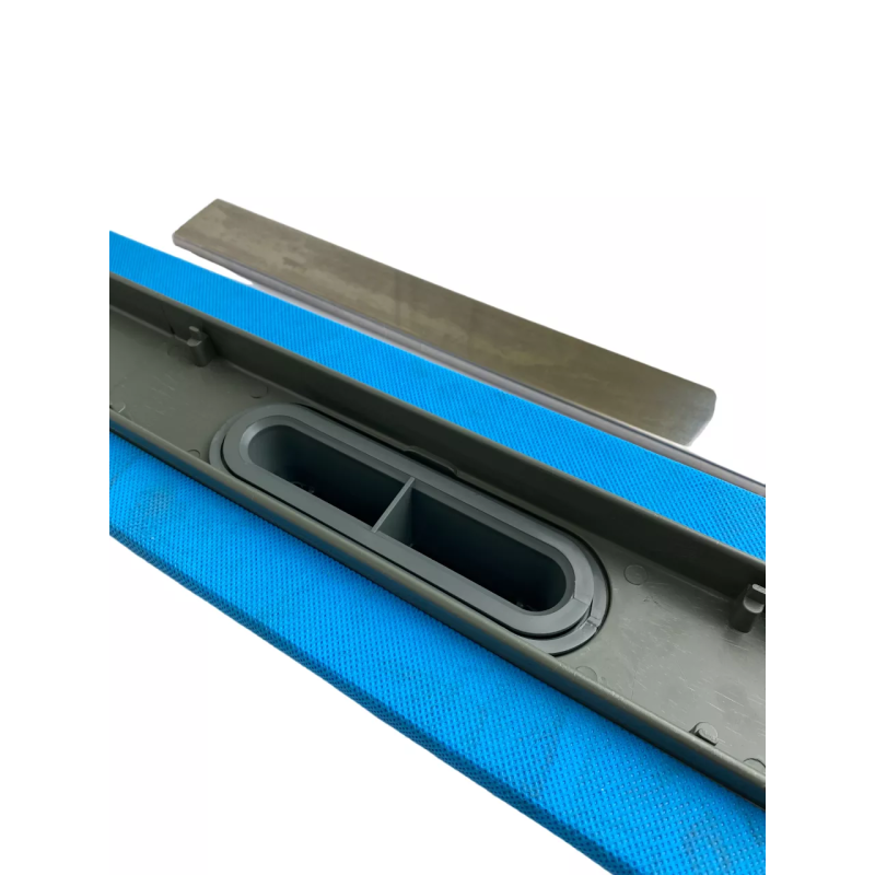 Декоративная решетка данной модели изготовлена из нержавеющей стали марки AISI 304. Толщина стали 1 мм, она выдерживает нагрузки до 300 кг. На решетку нанесена защитная ПЕ плёнка, снимать которую нужно после проведения облицовочных работ. Корпус лотка с фланцем, затвор и ножки изготовлены из прочного полипропилена. На фланец приклеена голубая герметизирующая лента для лучшей гидроизоляции вокруг самого изделия.