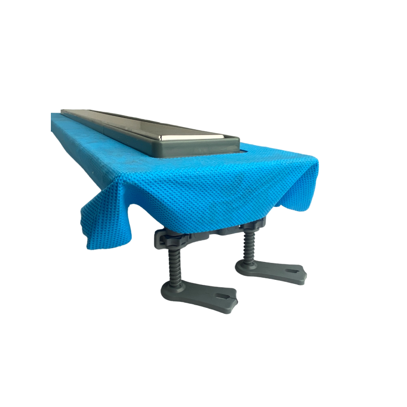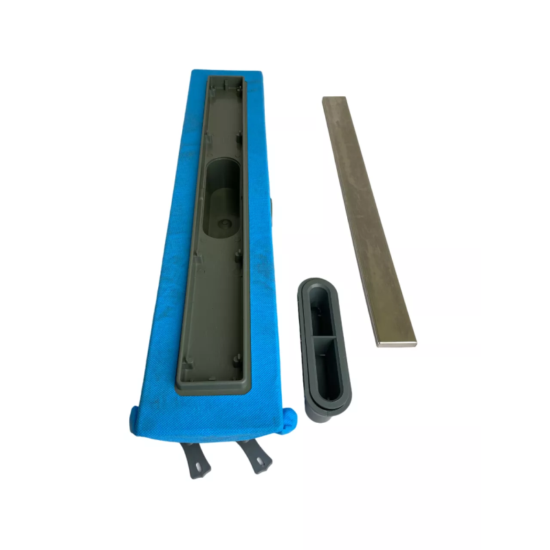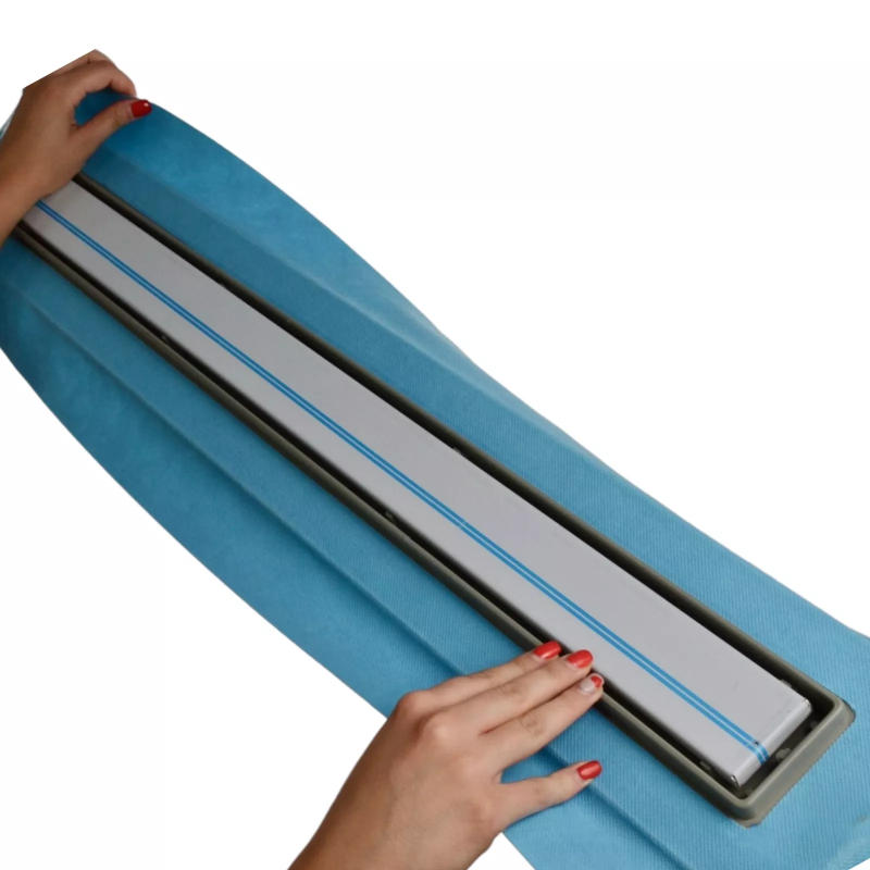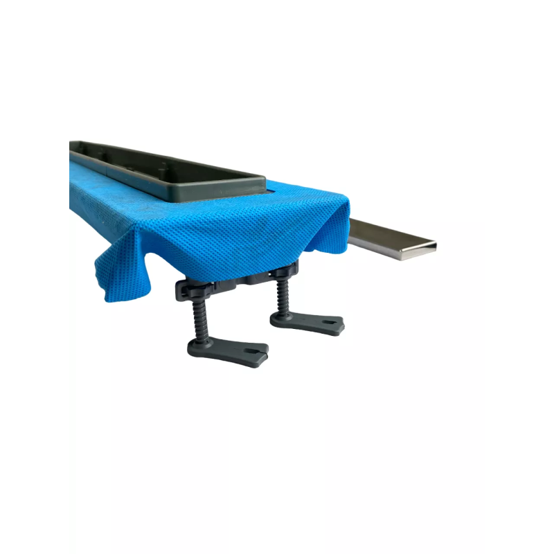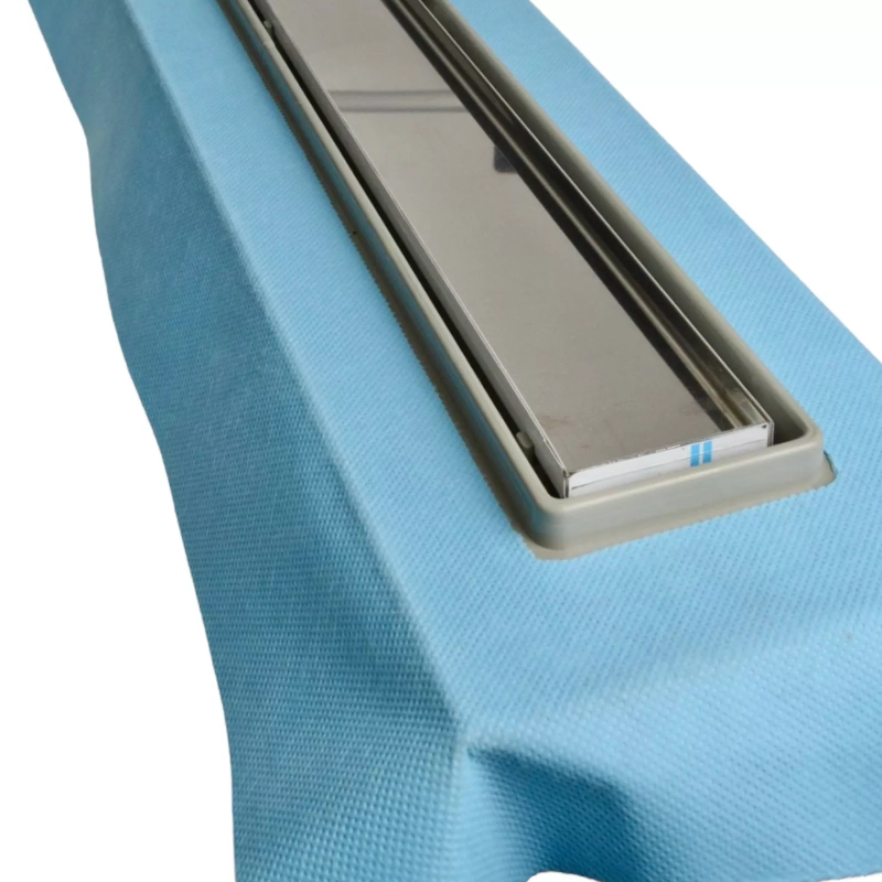 Декоративная решетка данной модели изготовлена из нержавеющей стали марки AISI 304. Толщина стали 1 мм, она выдерживает нагрузки до 300 кг. На решетку нанесена защитная ПЕ плёнка, снимать которую нужно после проведения облицовочных работ. Корпус лотка с фланцем, затвор и ножки изготовлены из прочного полипропилена. На фланец приклеена голубая герметизирующая лента для лучшей гидроизоляции вокруг самого изделия.