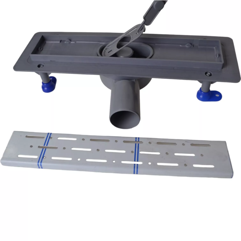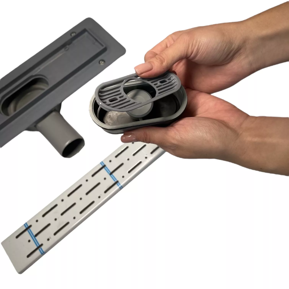 Корпус, затвор, ножки и горизонтальный фланец изготовлены из прочного полипропилена. Ножки лотка способствуют легкому монтажу за счет из регулировки высоты от 55-85мм. Фланец в данной конструкции нужен для надежной укладки гидроизоляции. Решетка изготовлена из нержавеющей стали марки AISI 304. На нее наклеена п/э пленка, которая служит защитой от грязи и царапин при монтаже и до момента эксплуатации.