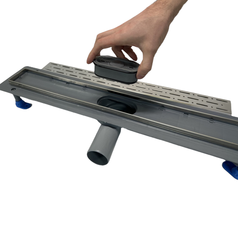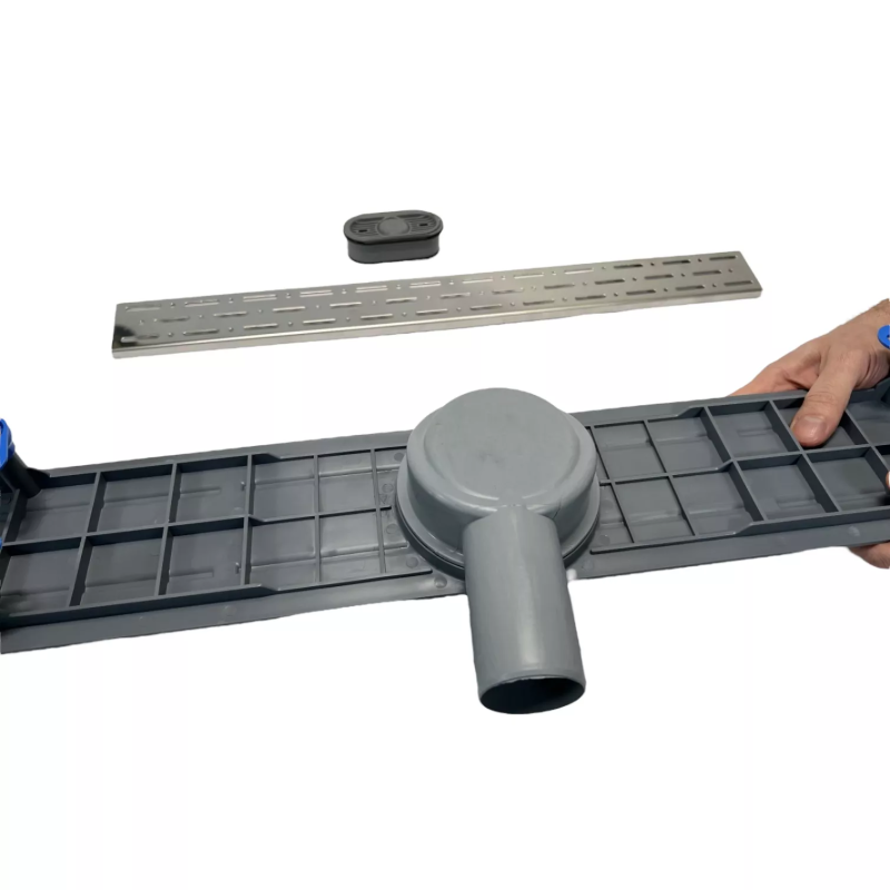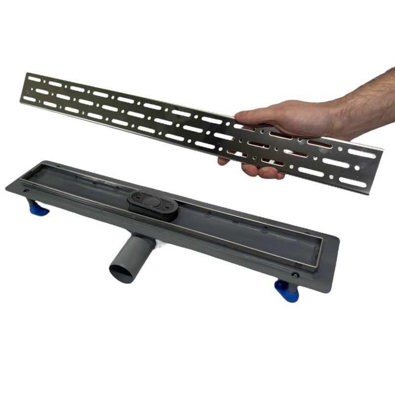 Корпус, затвор, ножки и горизонтальный фланец изготовлены из прочного полипропилена. Ножки лотка способствуют легкому монтажу за счет из регулировки высоты от 55-85мм. Фланец в данной конструкции нужен для надежной укладки гидроизоляции. Решетка изготовлена из нержавеющей стали марки AISI 304. На нее наклеена п/э пленка, которая служит защитой от грязи и царапин при монтаже и до момента эксплуатации.