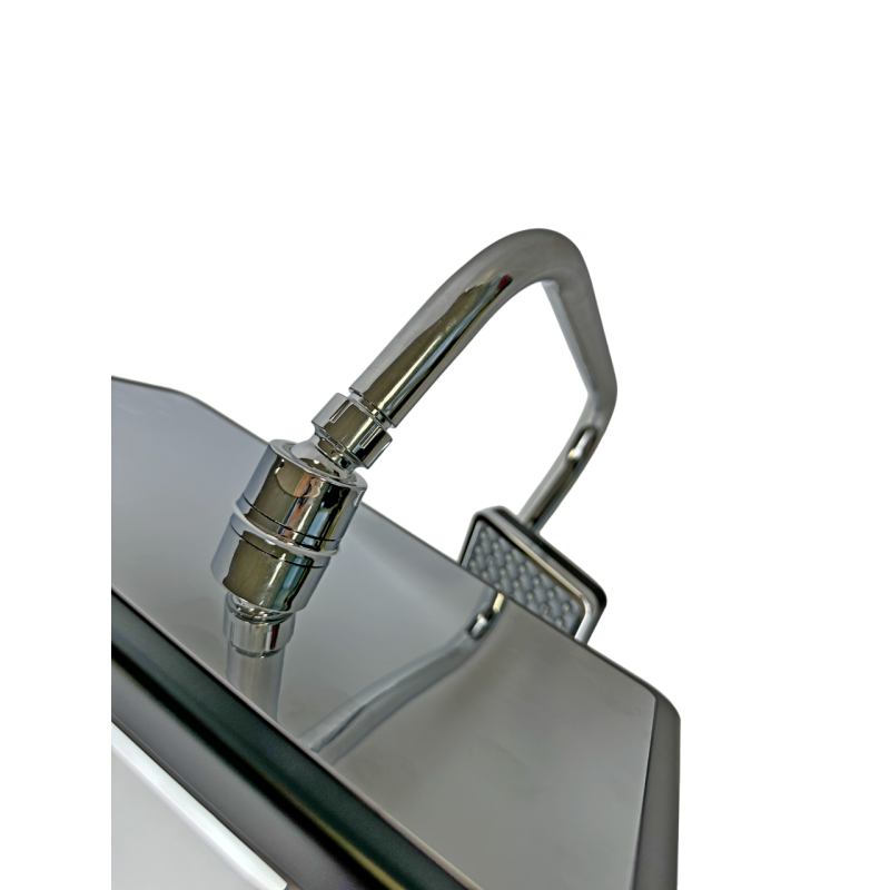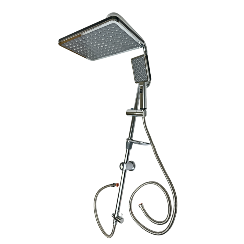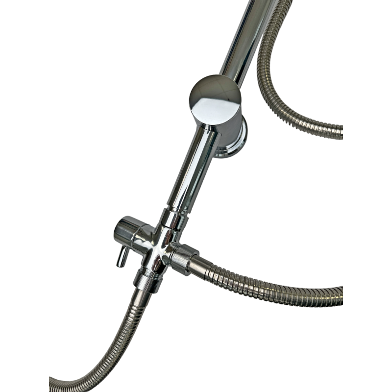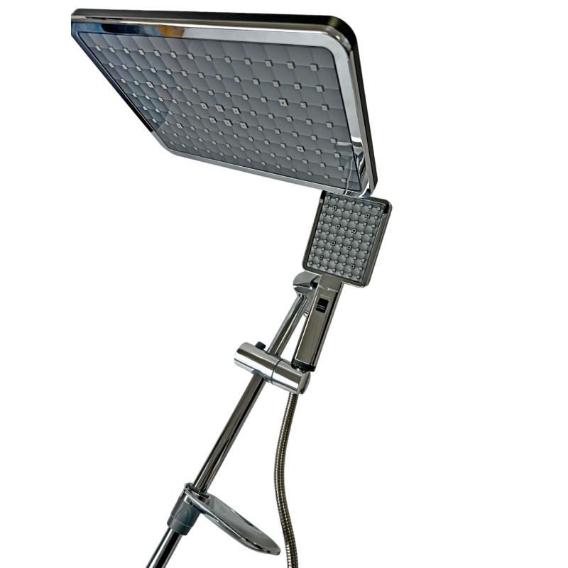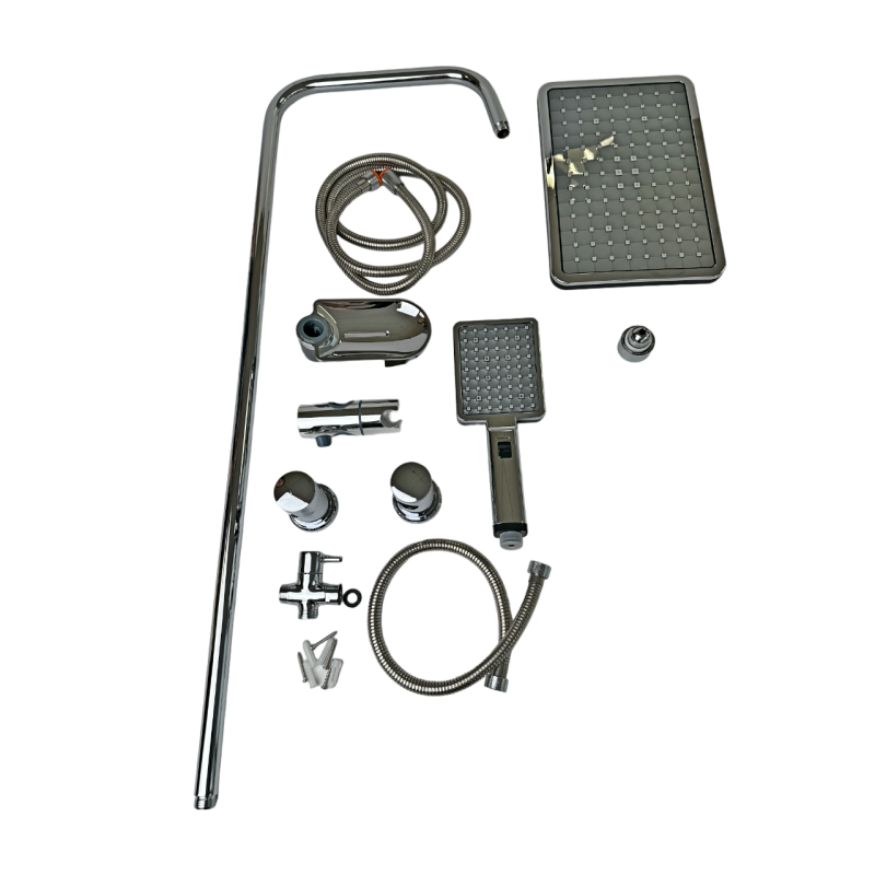 Материал: Душевая стойка и гибкий шланг изготовлены из нержавеющей стали AISI 304. Верхний душ и ручная лейка выполнены из прочного ABS пластика. Верхний душ имеет поворотный шарнир, позволяющий регулировать его в разные стороны.