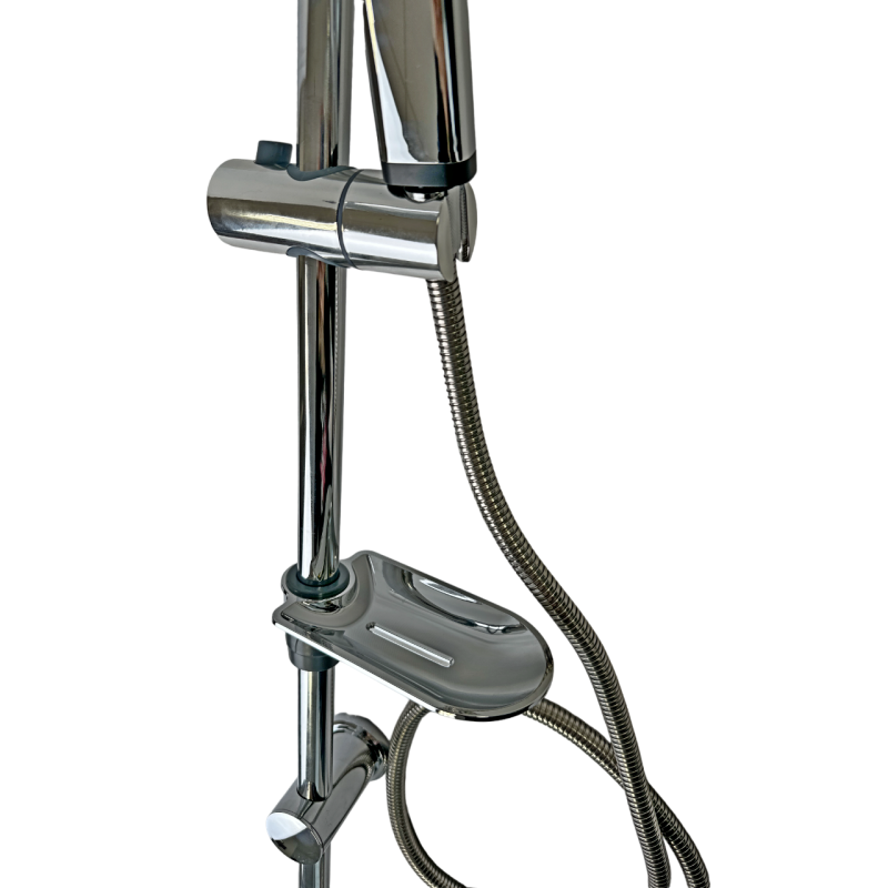 Комплектация: В комплект входят душевая стойка, кронштейн для верхнего душа, воронка верхнего душа, кронштейн для ручного душа, воронка ручная, мыльница, душевой шланг, шланг подключения подачи воды, крепежные элементы.