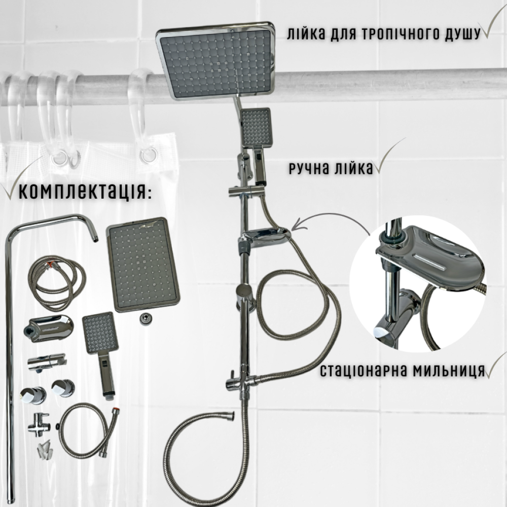 Функции: Система включает фиксированный верхний душ на стойке и ручную лейку с гибким шлангом. А также дополнительный шланг для подключения к смесителю. Также дополнительным бонусом на душевой штанге есть полочка для душевых средств. Переключатель на две функции позволяет выбирать между верхним и ручным душем. На душевой штанге имеется крепеж для фиксации ручного душа. Его можно регулировать по высоте.