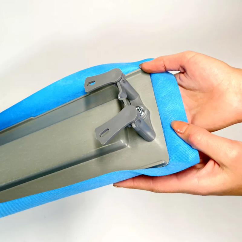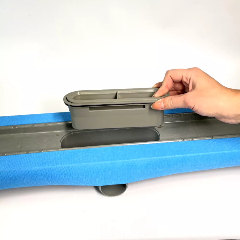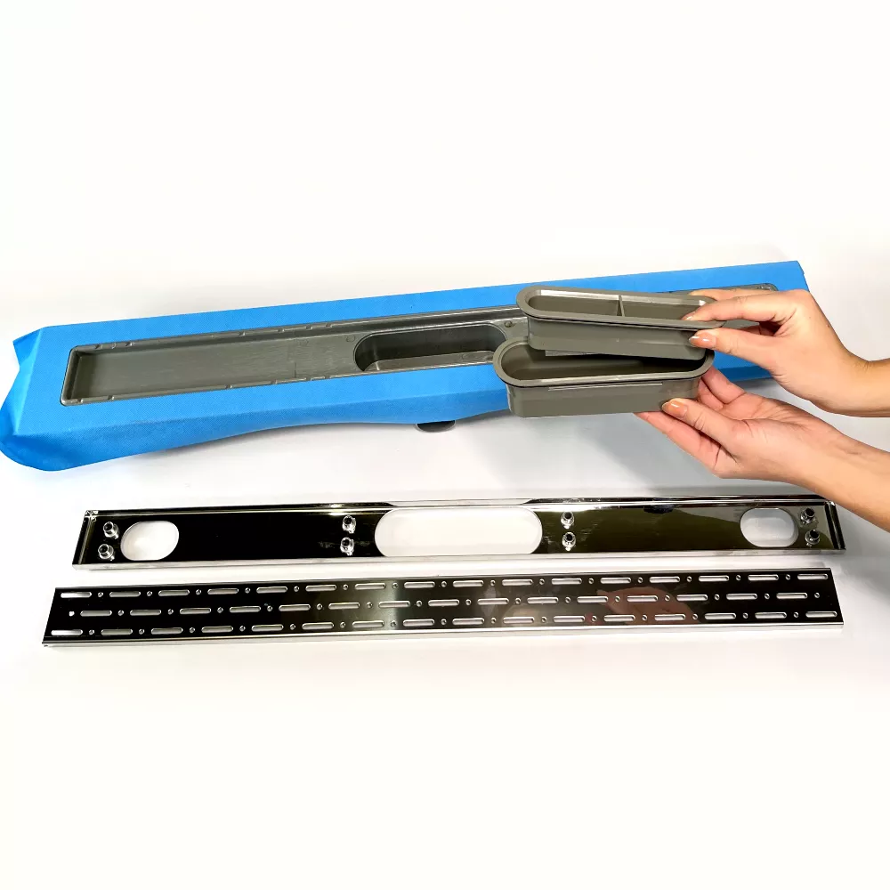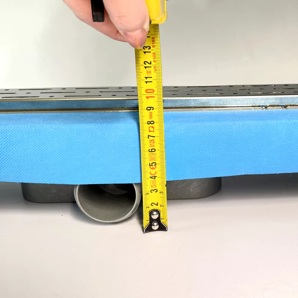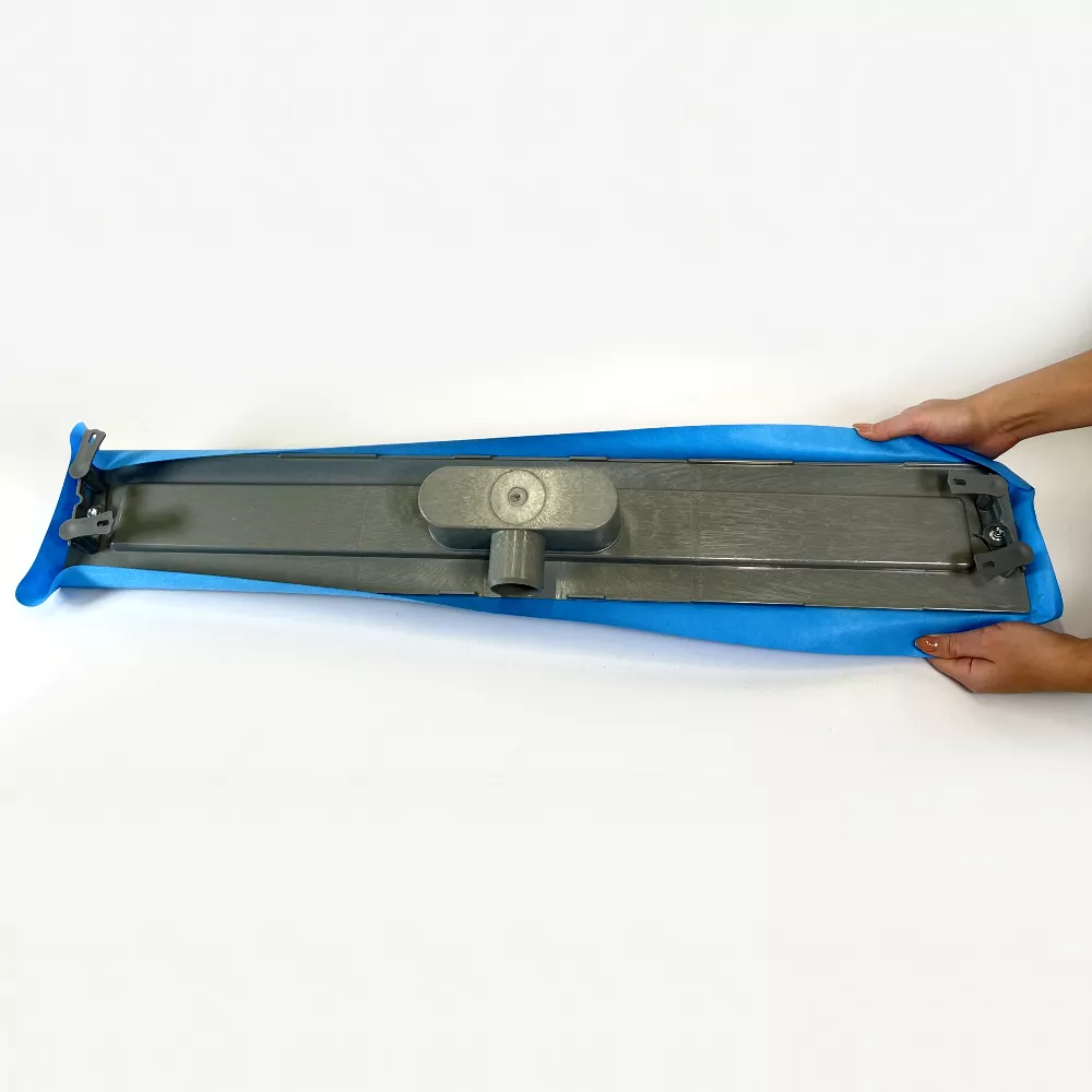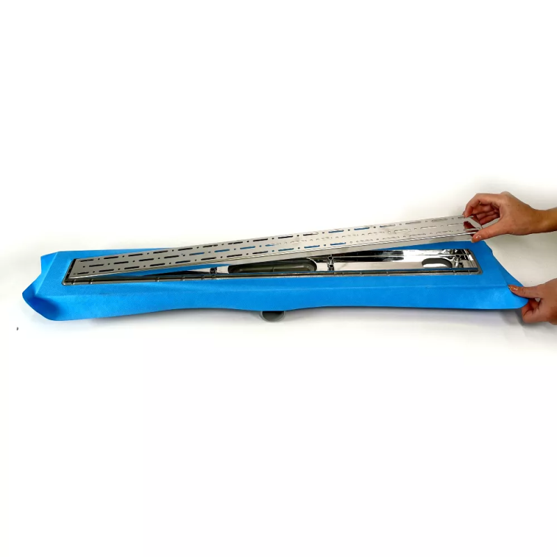 Декоративная решетка изготовлена из нержавеющей стали марки AISI 304.Толщина стали 1 мм, она выдерживает нагрузки до 300 кг. На решетку нанесена защитная ПЕ плёнка, снимать которую нужно после проведения облицовочных работ. Корпус лотка с фланцем, затвор и ножки изготовлены из прочного полипропилена. На фланец приклеена голубая герметизирующая лента для лучшей гидроизоляции вокруг самого изделия. Рамка дополнительно регулируется по высоте.