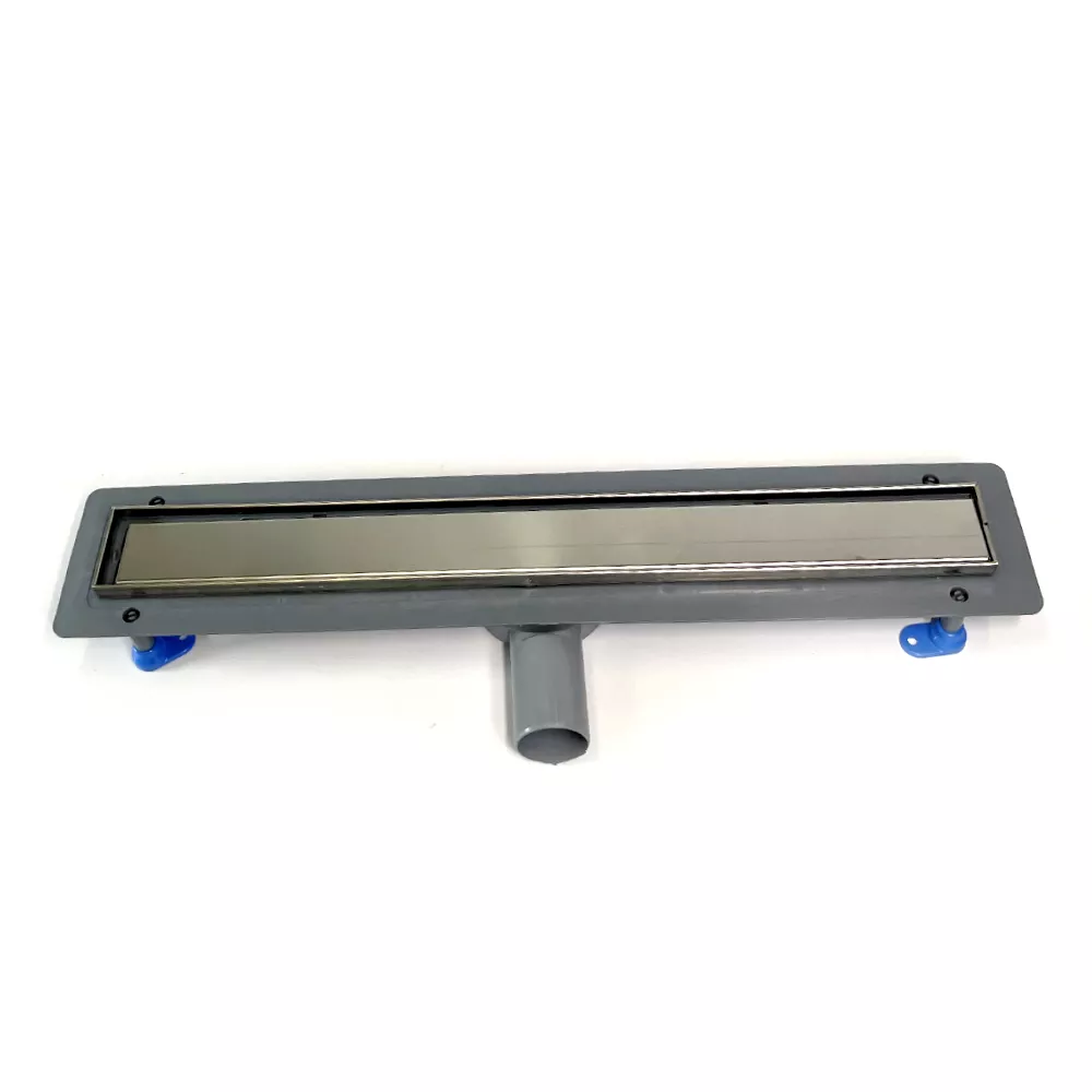 Корпус, затвор, ножки и горизонтальный фланец изготовлены из прочного полипропилена. Ножки лотка способствуют легкому монтажу за счет из регулировки высоты от 55-85мм. Фланец в данной конструкции нужен для надежной укладки гидроизоляции. Решетка изготовлена из нержавеющей стали марки AISI 304. На нее наклеена п/э пленка, которая служит защитой от грязи и царапин при монтаже и до момента эксплуатации.