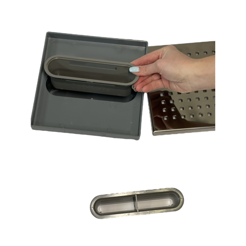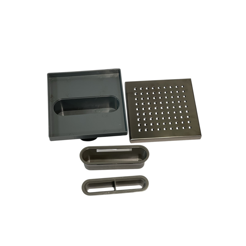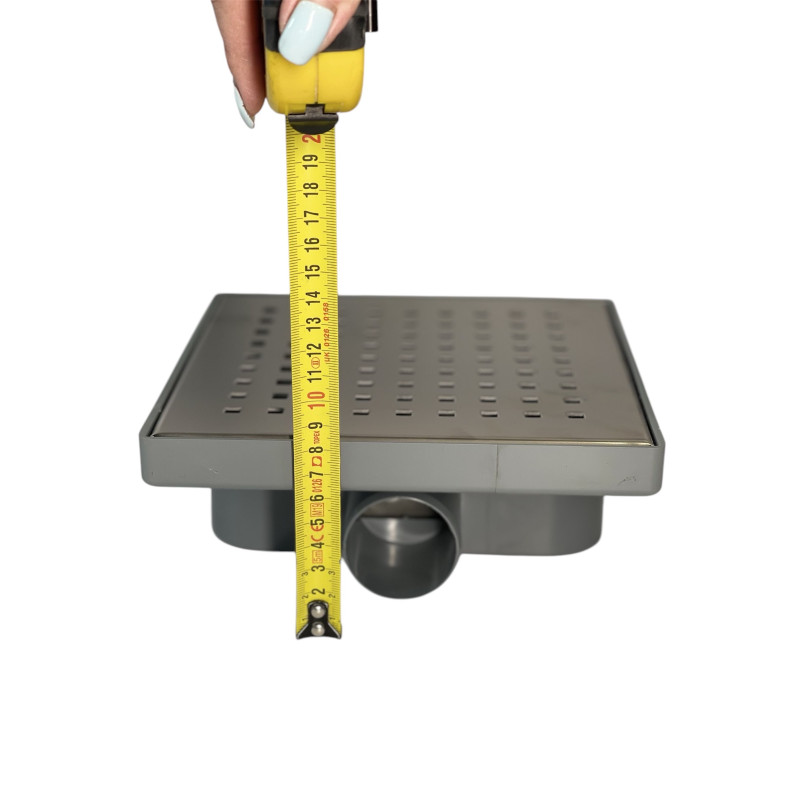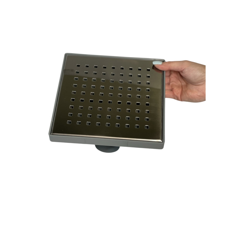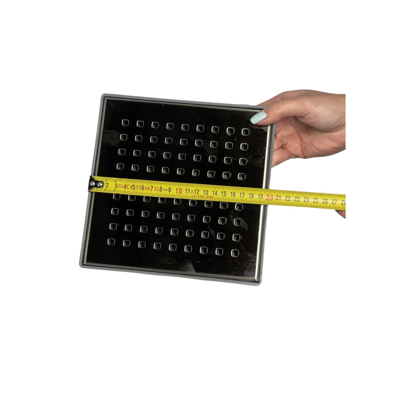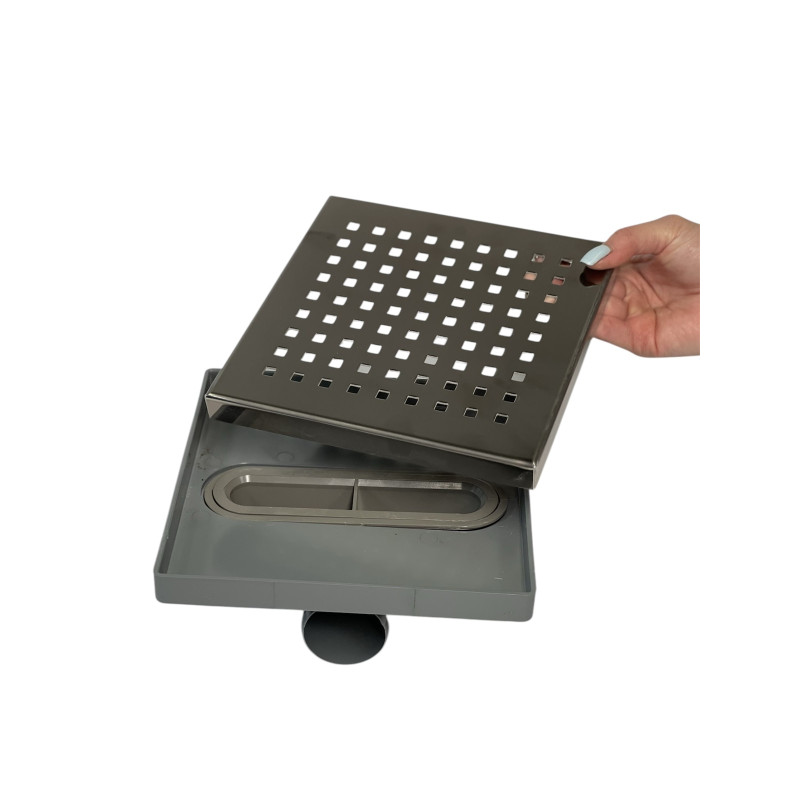 Подходит даже малых и больших душевых кабин. Квадратная решетка с рисунком «круг» выглядит привлекательно и комфортна в обслуживании. Ее легко снять для очистки трапа от мусора и волос.