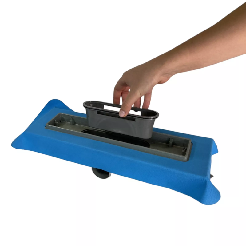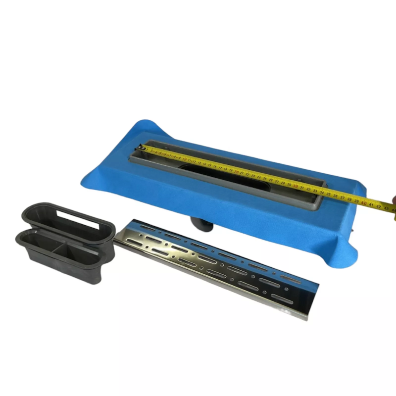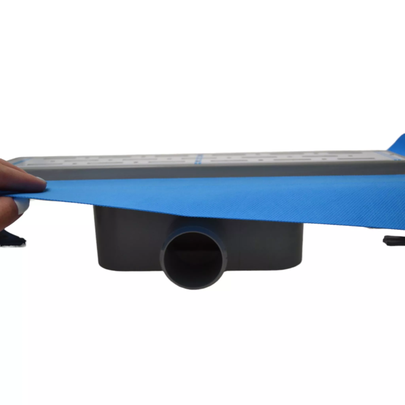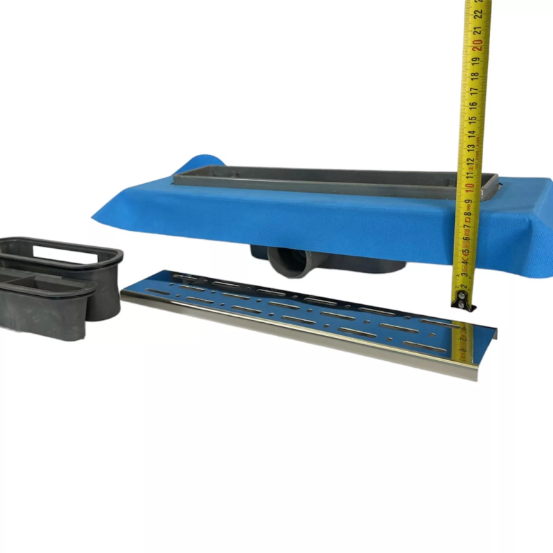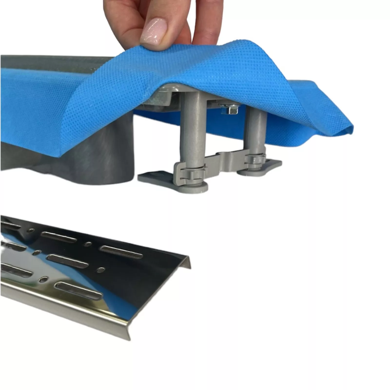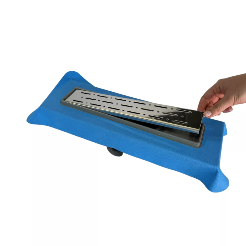 Декоративна решітка даної моделі виготовлена з нержавіючої сталі марки AISI 304. Товщина стали 1 мм, вона витримує навантаження до 300 кг. На решітку нанесена захисна плівка ПЕ, знімати яку потрібно після проведення облицювальних робіт. Корпус лотка з фланцем, затвор і ніжки виготовлені з міцного поліпропілену. На фланець приклеєна блакитна герметизуюча стрічка для кращої гідроізоляції навколо самого виробу.