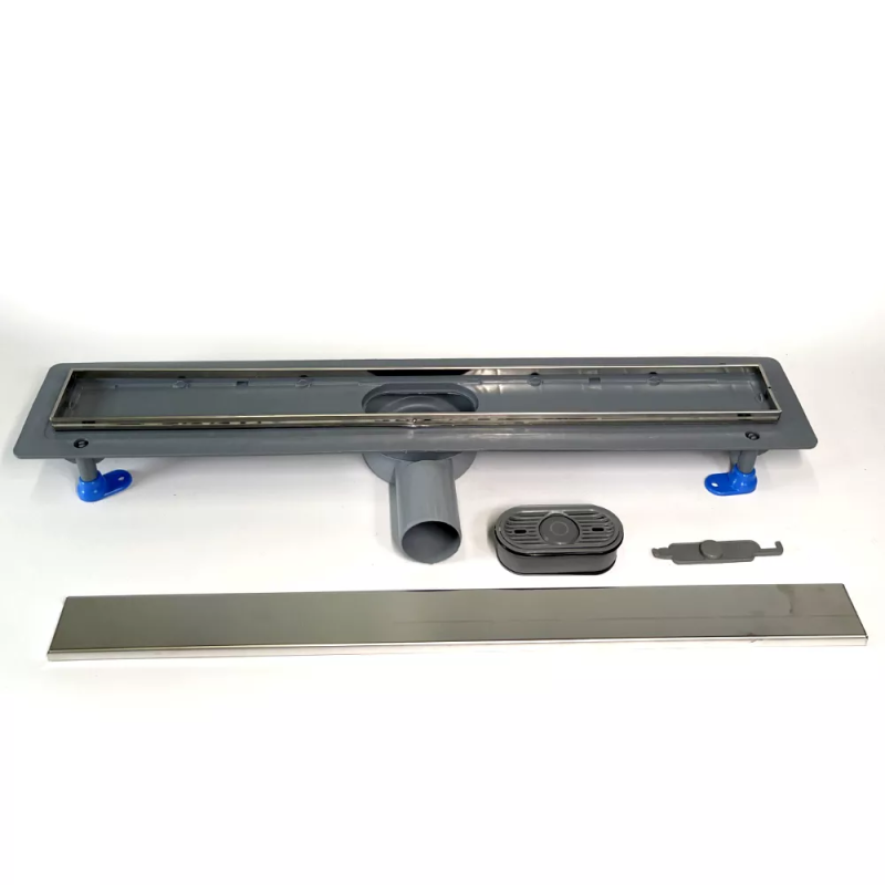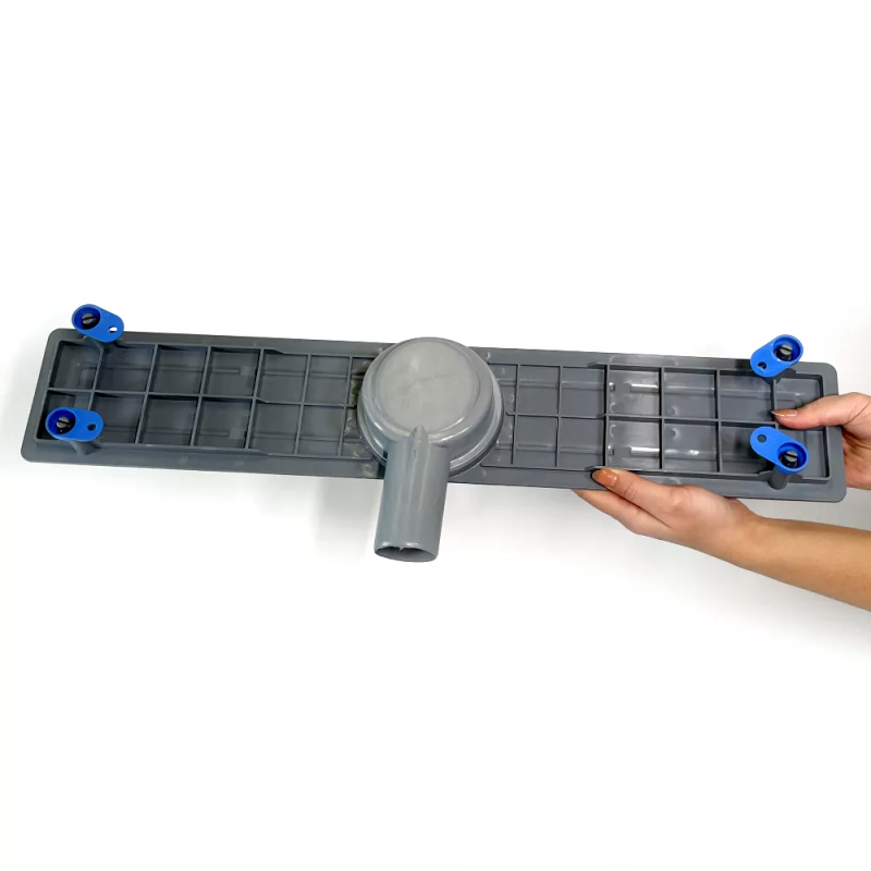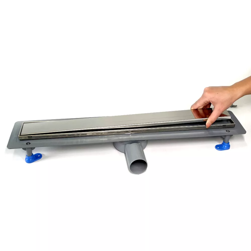 Корпус, затвор, ніжки і горизонтальний фланець виготовлені з міцного поліпропілену. Ніжки лотка сприяють легкому монтажу за рахунок регулювання висоти від 55-85мм. Фланець у даній конструкції потрібен для надійної укладання гідроізоляції. Решітка виготовлена з нержавіючої сталі марки AISI 304. На неї наклеєна п/е плівка, яка служить захистом від бруду і подряпин при монтажі і до моменту експлуатації.