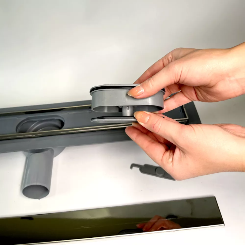 Ще одна ключова перевага даної моделі це – сухий затвор. Він працює за принципом «хлопавки», яка відкривається від тиску стічної води, і також легко закривається після її стоку. Даний затвор точно не дасть каналізаційних запахів потрапити в приміщення. При очищенні стоку від волосся досить зняти решітку з допомогою гачка і видалити сміття з ринви.