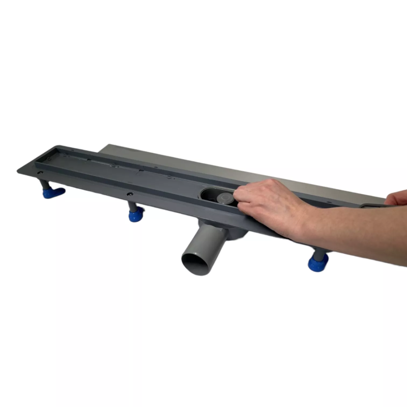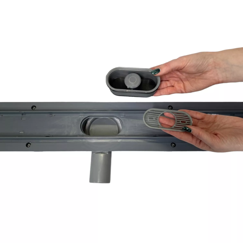 Усередині жолоба встановлений сухий затвор, що перешкоджає проникненню запахів у приміщення. Він працює за принципом «хлопавки», яка відкривається від тиску стічної води, і також легко закривається після її стоку. Пропускна здатність лотка 32л/хв – це в 2-3 рази вище, ніж подача води навіть з найбільшою лійки. Якщо у сток лотка потрапили волосся або дрібне сміття, скористайтесь гачком (йде в комплекті) для того щоб зняти решітку і видалити забруднення.