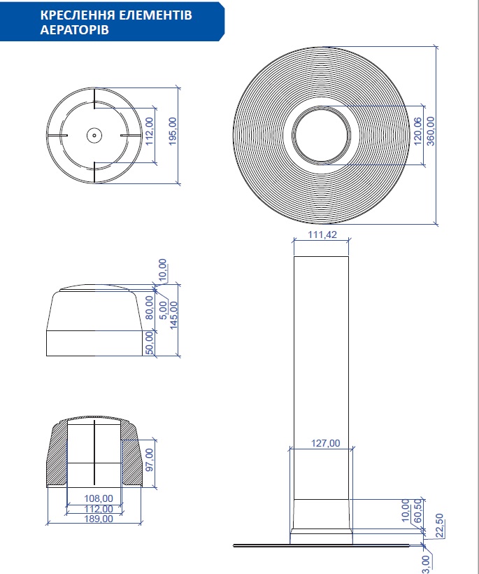 Аэратор (дефлектор) состоит из корпуса и защитного колпачка. Диаметр трубы дефлектора составляет 110 мм. Высота – 600мм.