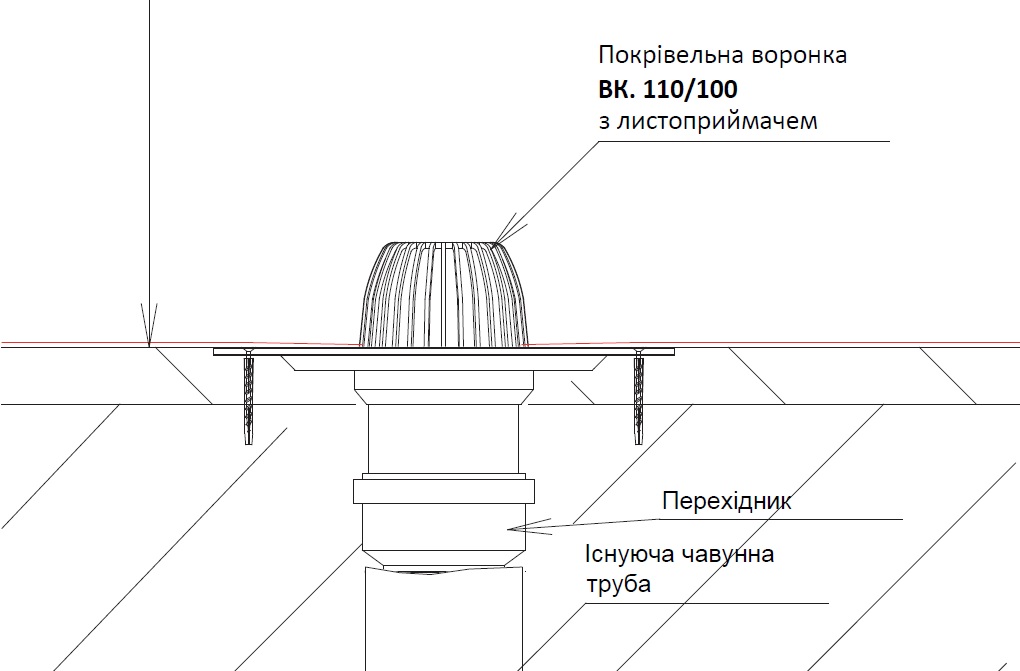 Корпус воронки дает плотное прилегание к гидро-, пароизоляционному слою плоской кровли, а листоуловитель предотвращает попадание листьев и другой мусор в водоотводную систему кровли.