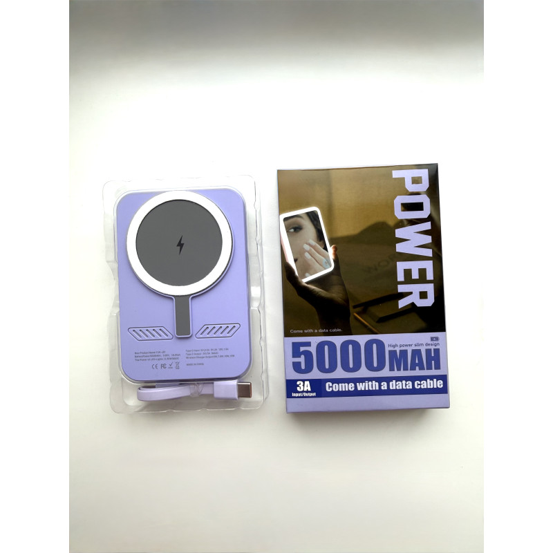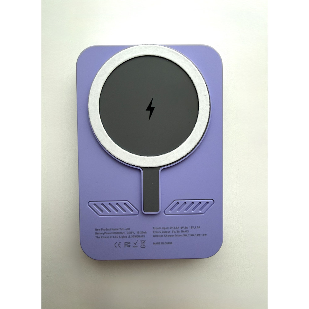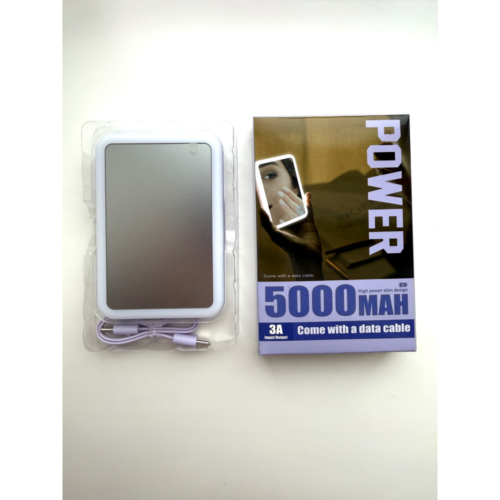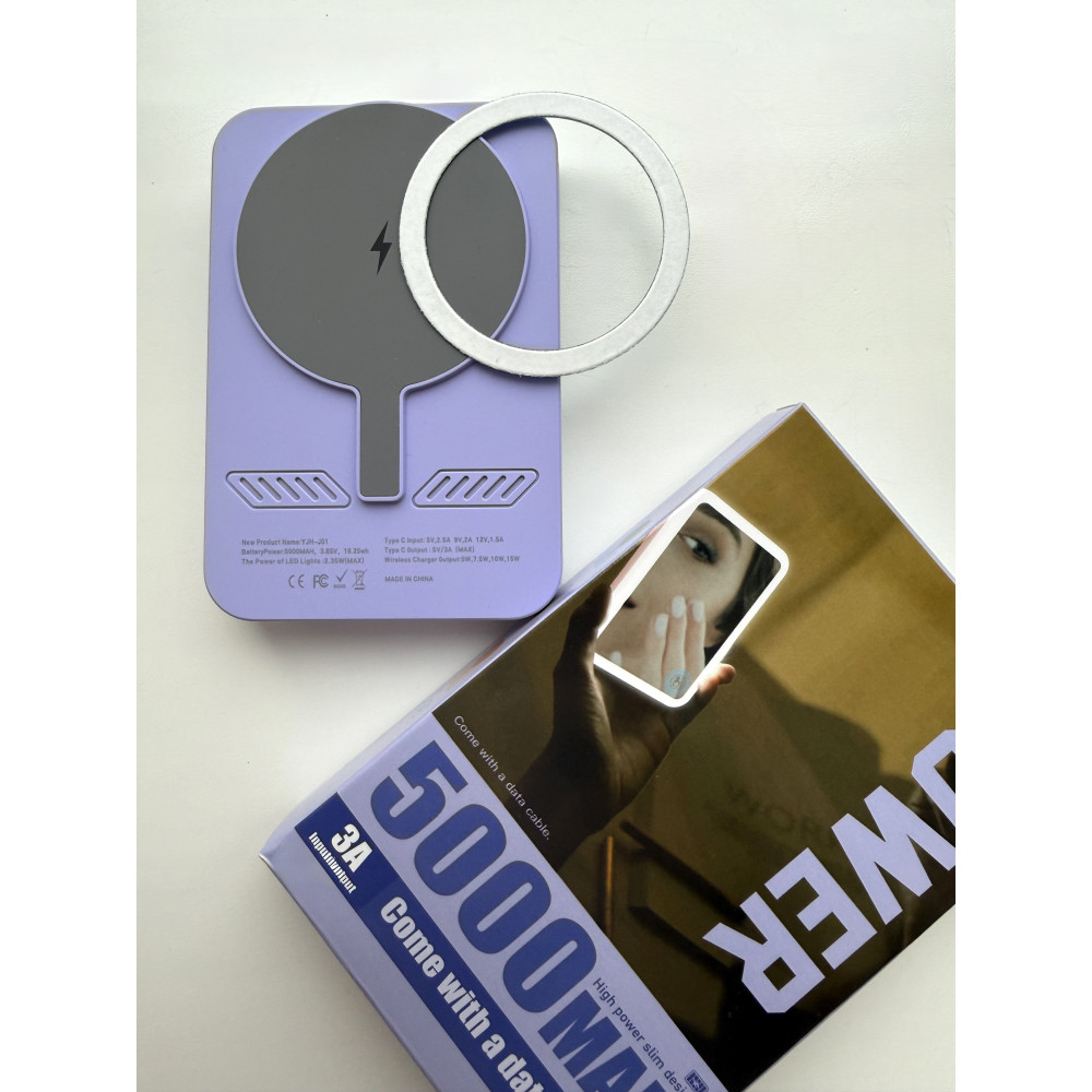 Повербанк 5000 mAh с беспроводной зарядкой, встроенным зеркалом и LED-подсветкой, цвет фиолетовый