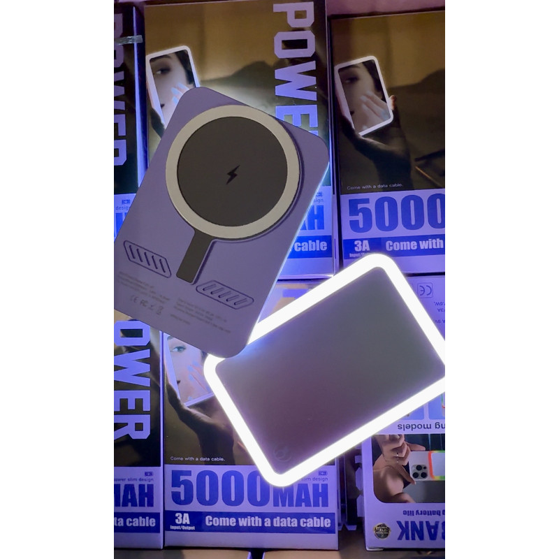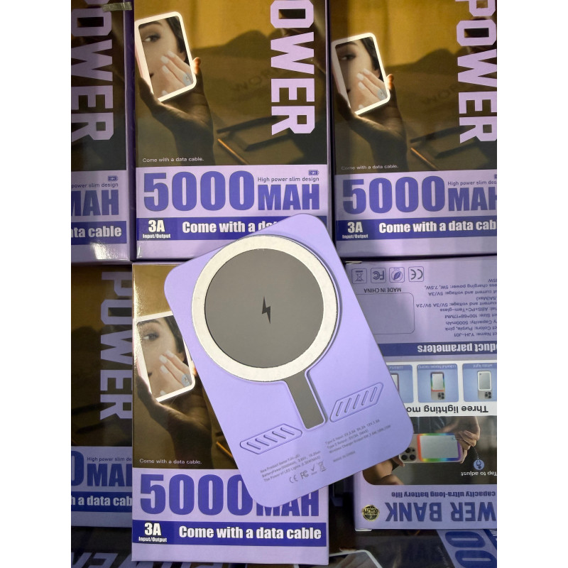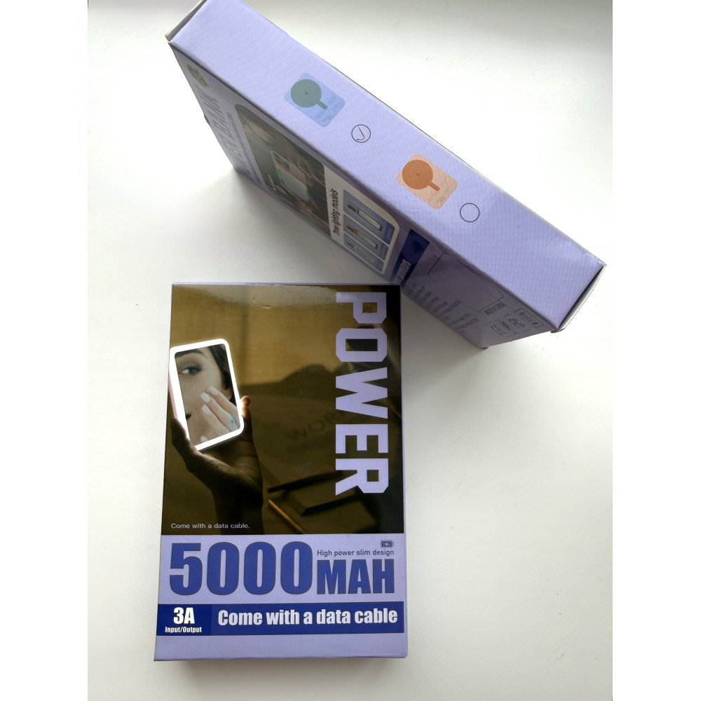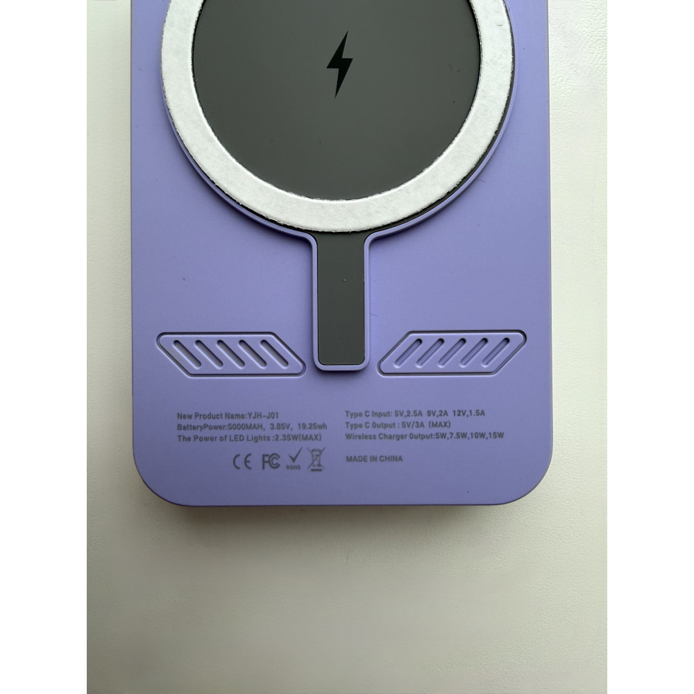 Повербанк 5000 mAh с беспроводной зарядкой, встроенным зеркалом и LED-подсветкой, цвет фиолетовый