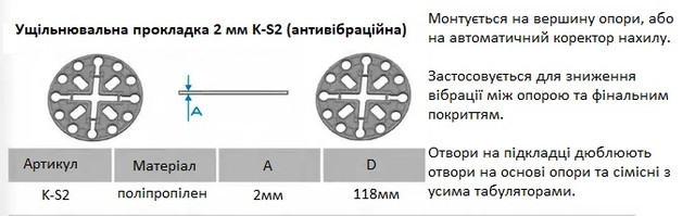Антивібраційна підкладка K-S2 - монтується на вершину опори або на автоматичний коректор нахилу. Підкладка знижує вібрацію між опорою та фінішним покриттям. Товщина підложки 2мм. Вона має отвори, які повністю повторюють отвори на опорі.