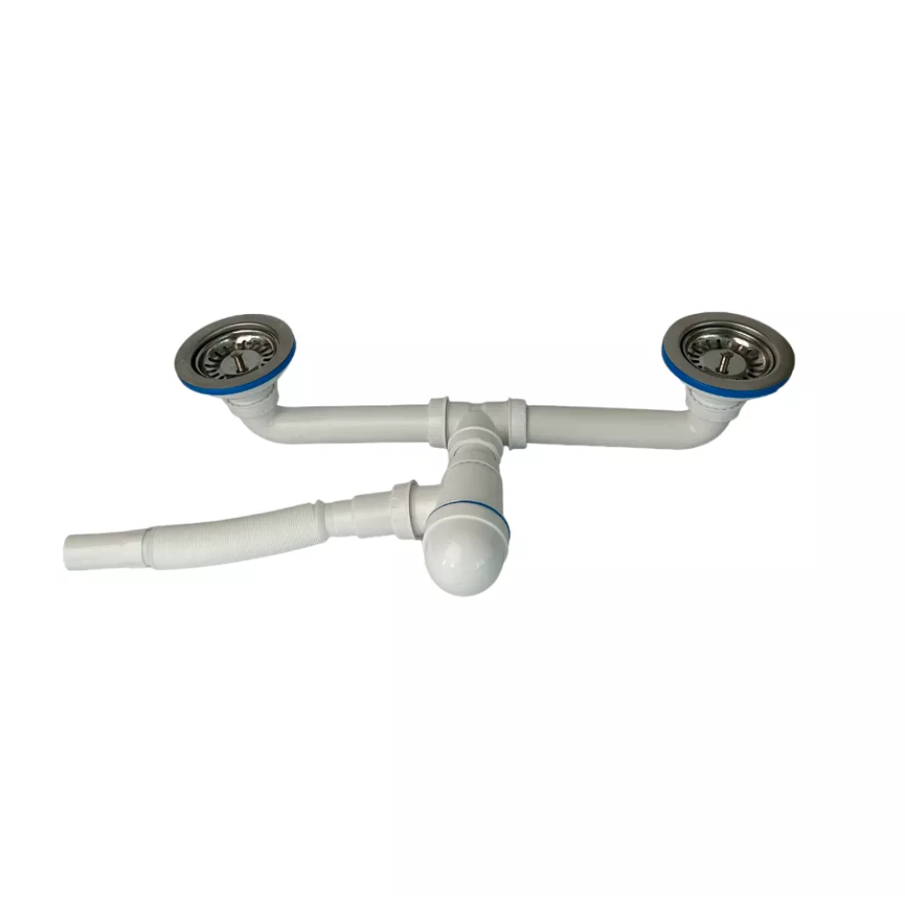 Double siphon Ø65-32mm - suitable for all double models of kitchen sinks, both domestic and foreign manufacturers. The siphon body is made of durable and high-quality polypropylene. The drain grate and mounting dowel are made of AISI 304 stainless steel. The diameter of the drain grate is 115mm. The diameter of the pipe for connecting to the sewer is 32mm. A feature of this model is the presence of an overflow. Characteristics: Type: siphon Purpose: for kitchen sinks Type: bottled Material: polypropylene Opening/closing of drain holes: mechanical (manual) Connection diameter: 32mm Drain diameter: 115mm Features: double Connection to washing machine: no Color: white