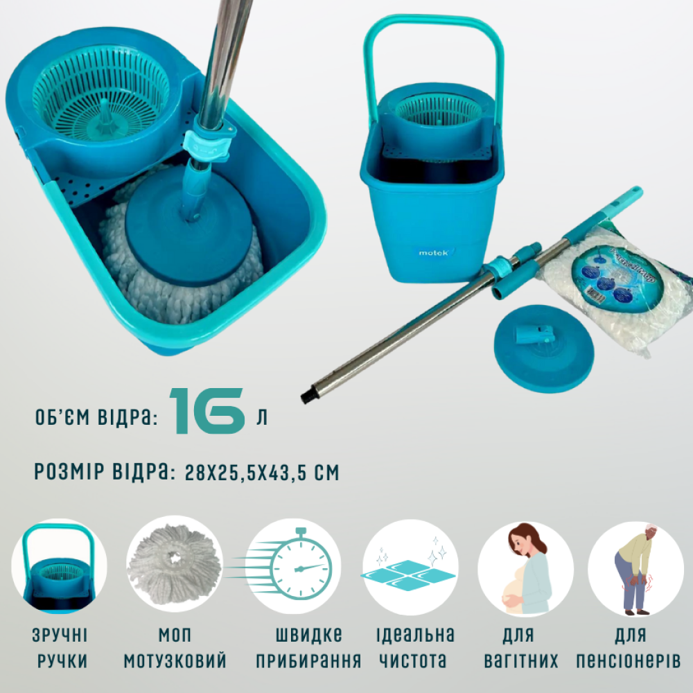 Набір для прибирання: відро на 16л, швабра та моп круглий