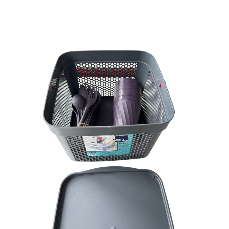 Корзина имеет квадратную форму, удобную ручку и крышку, которая может использоваться как поднос – практическое решение для сервировки на природе.