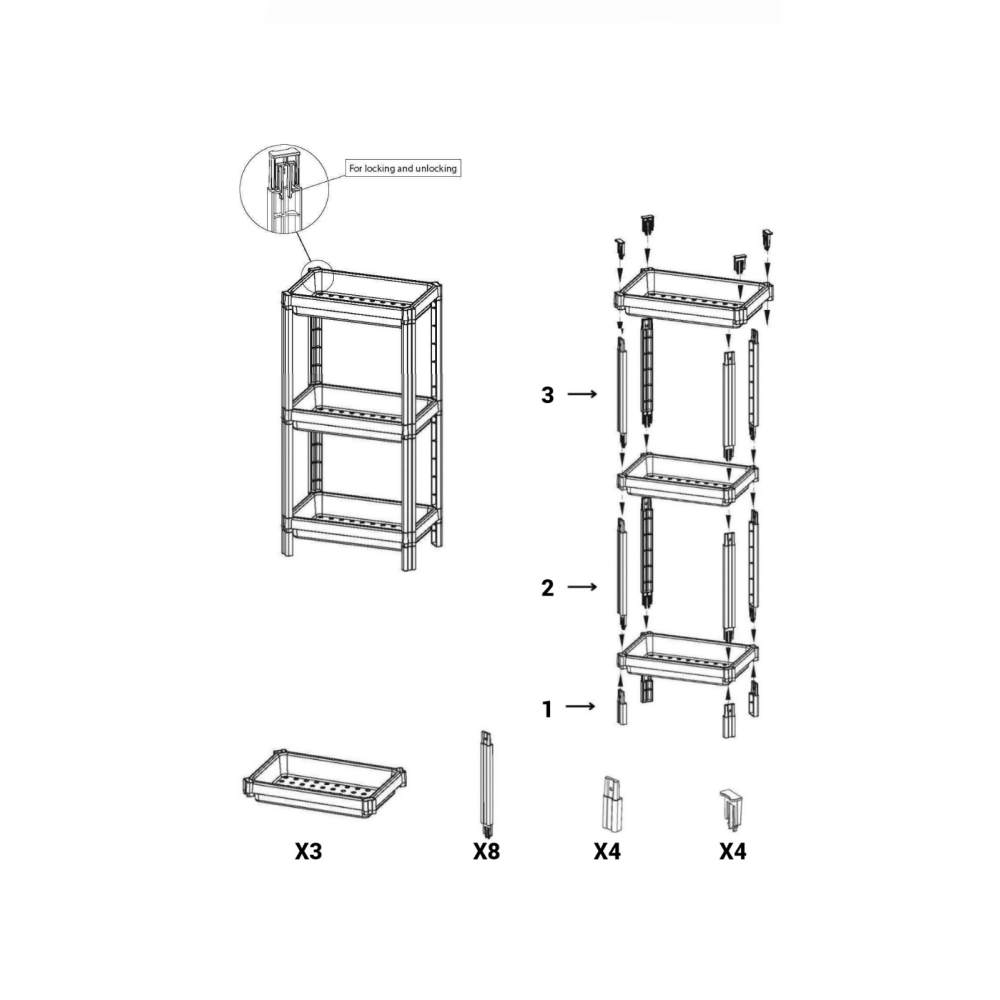 Полочка является сборной: ярусы и соединительные элементы поставляются отдельно, что обеспечивает удобство при сборке и разборке. В разобранном виде занимает минимум места, а защитная пленка на элементах уберегает от царапин во время транспортировки.
