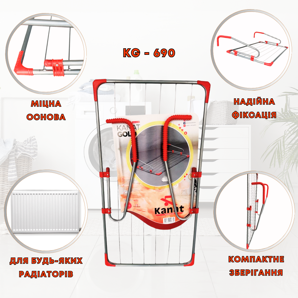 Навесная сушка для белья KANAT Gold KG-690 - функциональное и практичное изделие, которое пригодится каждой хозяйке. С помощью специальных ручек зацепов, сушку можно легко повесить на радиатор, дверь или полотенцесушитель. Такое крепление является мобильным и его можно снять после использования. Сушилка занимает мало места, не требует много времени для установки и особых условий использования.