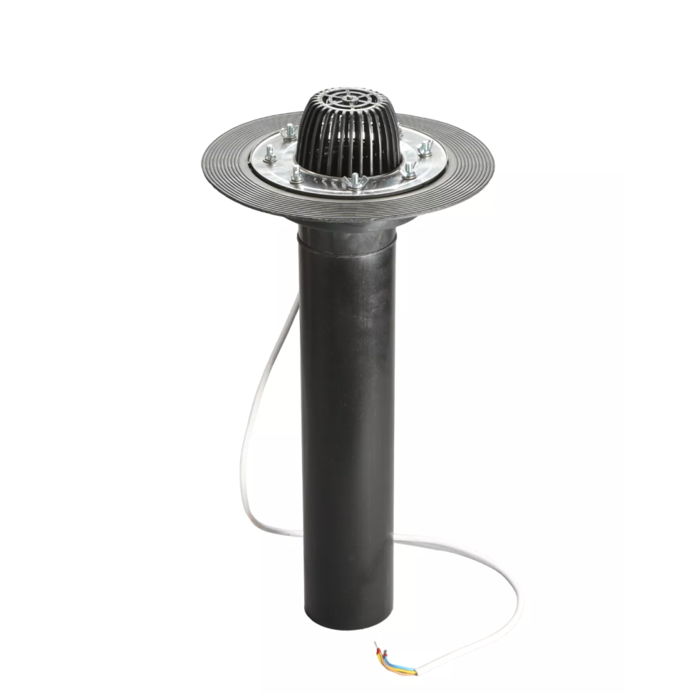 Кровельная воронка с фланцем из нержавеющей стали и кабелем обогрева , высотой 100 или 600 мм состоит из: корпуса с трубой диаметром 110мм, нержавеющего прижимного фланца, набора для его крепления к корпусу воронки, листоуловителя и системы обогрева.