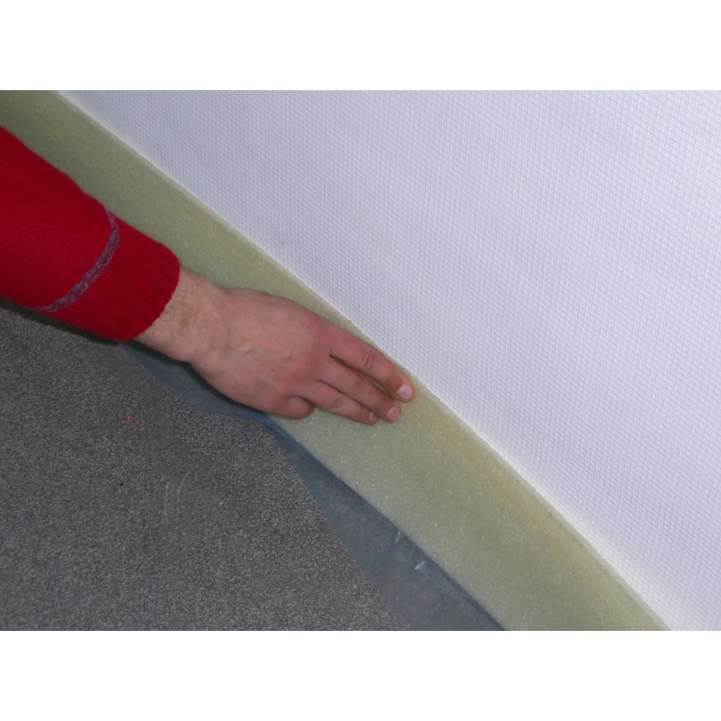 Демпферная лента имеет защитный передник из полиэтиленовой пленки, который не только закрывает щели между стеной и полом, но и защищает ленту от агрессивного бетона.